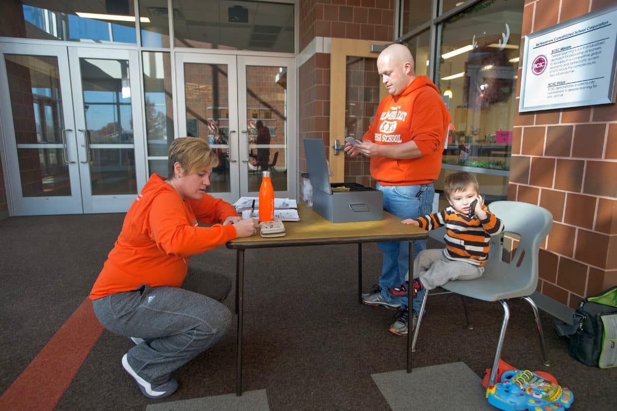Kylie Weichman, left, buys tickets for the IHSAA class 5A state championship football game from Columbus East assistant athletics Director Tyler Davis, center, as his son Tristan plays with toys inside the main entrance of Columbus East High School in Columbus, Ind., Monday, Nov. 21, 2016. Mike Wolanin | The Republic
