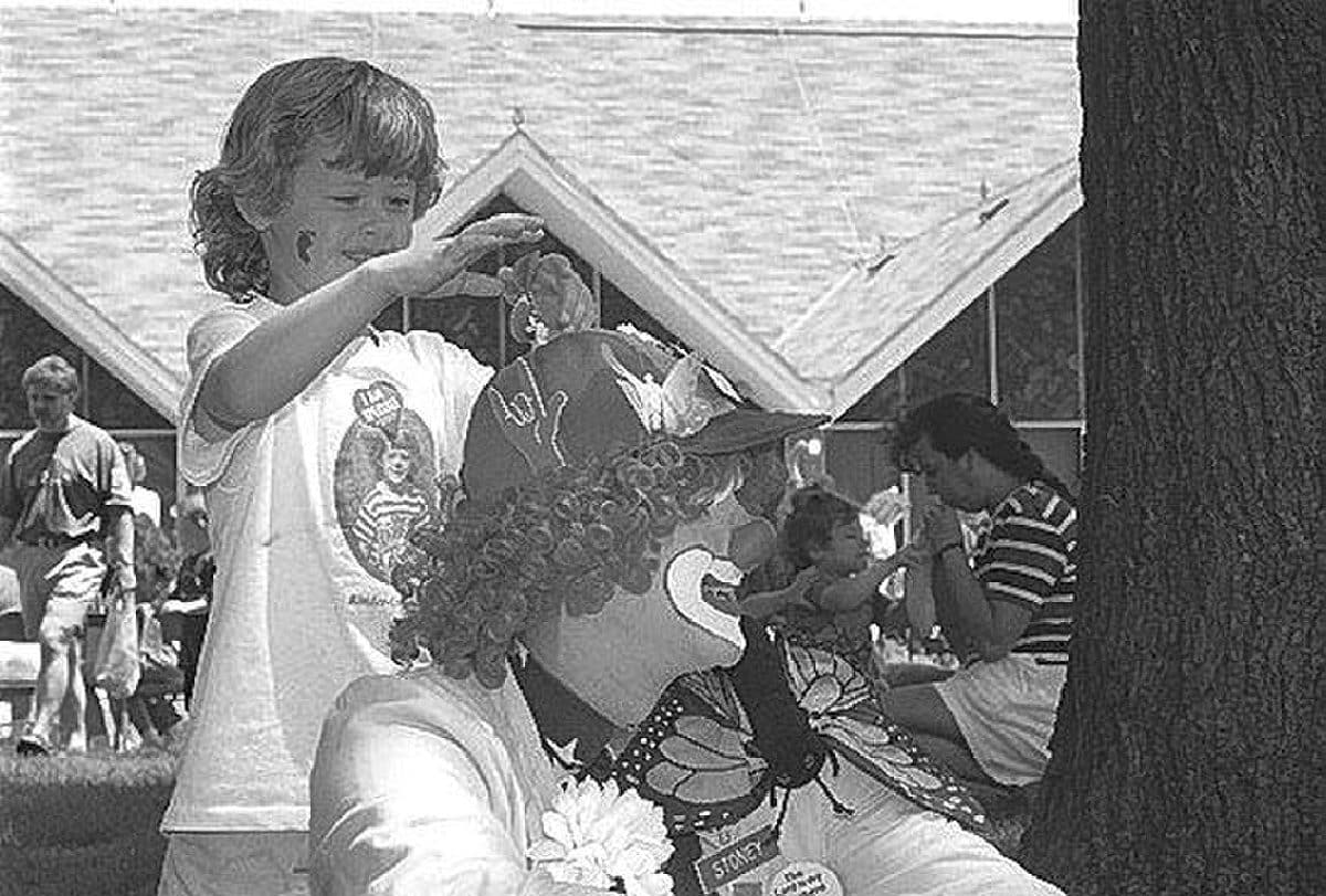 Tiffany McCrory found spinning the propeller on Stoney the Clown's hat amusing during the Columbus Christian School Carnival in 1995. From The Republic archives