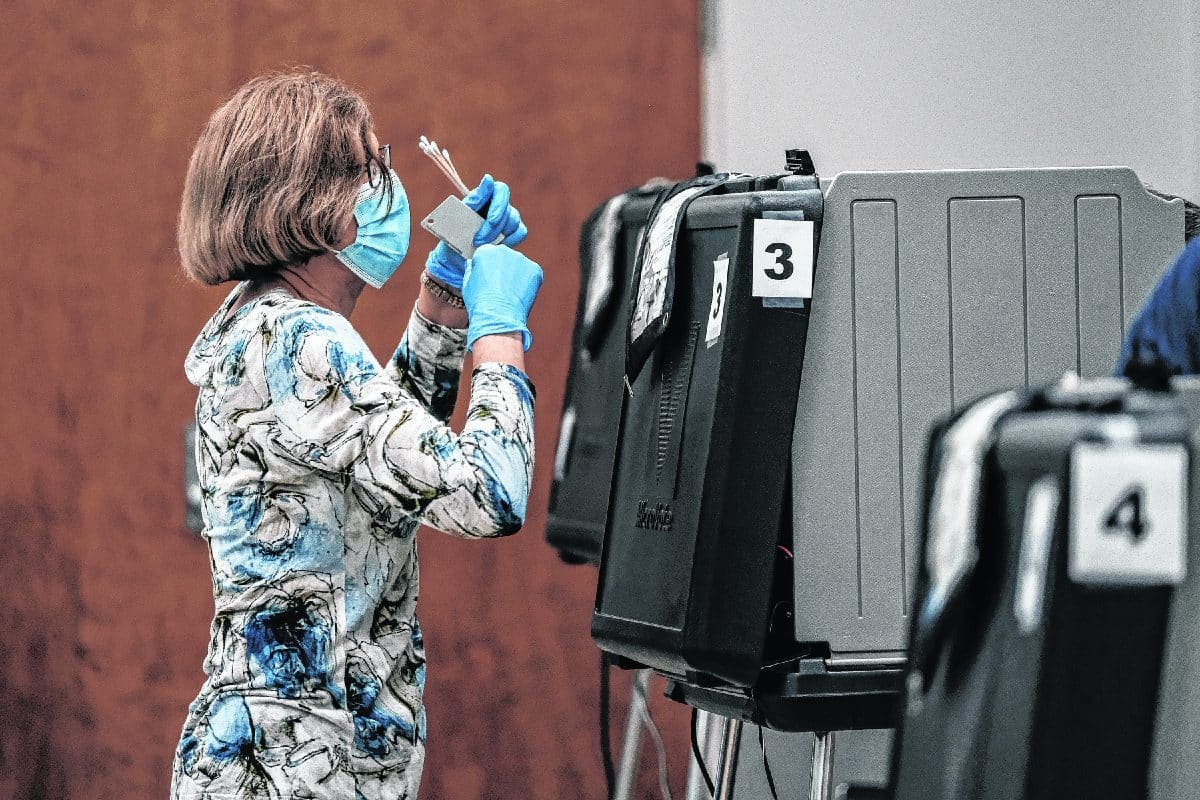 Election official Glinda Ellison wears a mask and gloves as she works the polling center in Donner Center on the first day of in-person voting in Columbus, Ind., Tuesday, May 26, 2020. The Indiana primary was delayed to June 2 to stop the spread of the coronavirus. Mike Wolanin | The Republic