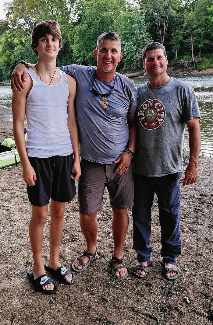 Toby Stigdon’s 14-year-old son, Chase, left, was able to join him and partner Greg Foley for part of the 200-mile Kayaking for Cancer paddle that raised $21,000 for the Schneck Foundation.