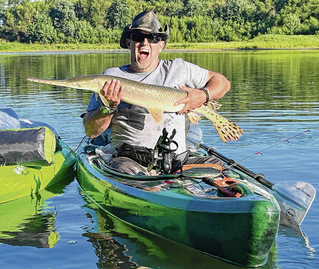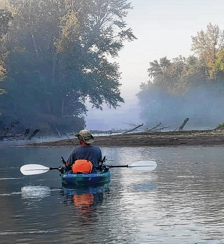 In between strokes in the waters of the White River, Toby Stigdom displays one of many fish caught. The paddlers cast for whatever would bite.