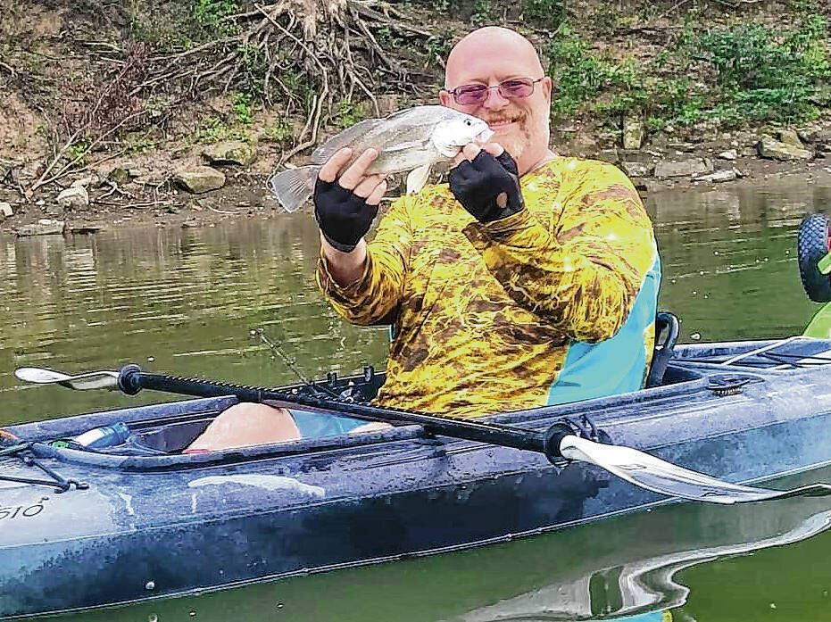 Toby Stigdon’s cousin, B.J. Strong, who traveled partway, holds a fish he caught on the White River while paddling.