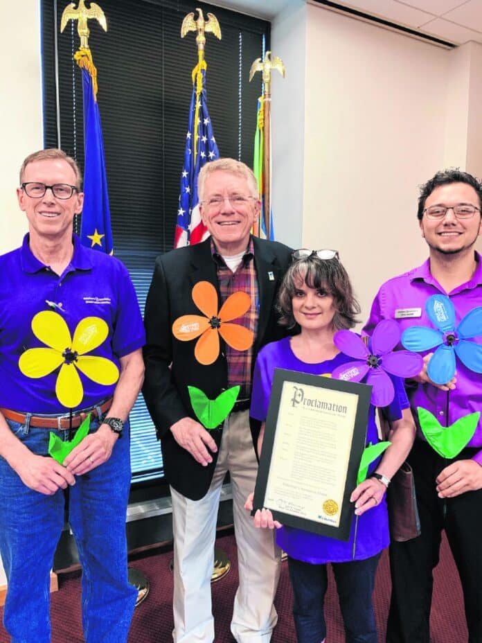 Columbus Mayor Jim Leinhoop issued a proclamation to the Columbus Walk to End Alzheimer's planning committee members on May 30 to declare June as "Alzheimer's Awareness Month." The committee hopes to build more awareness about the warning signs of Alzheimer's and dementia, including early detection. Visit alz.org/ourstories for more information. Pictured are, from left: volunteer Tim Huffman, Lienhoop, volunteer Jill Tasker and staff partner Kyle Davern.