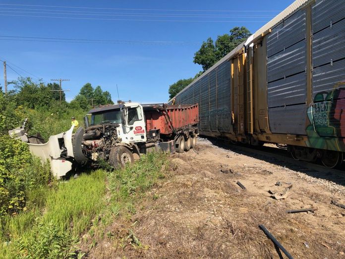 A STE Schneider dump truck carrying metal was struck by a CSX train on County Road 750W just north of U.S. 50 in Jennings County. The area is west of Hayden.