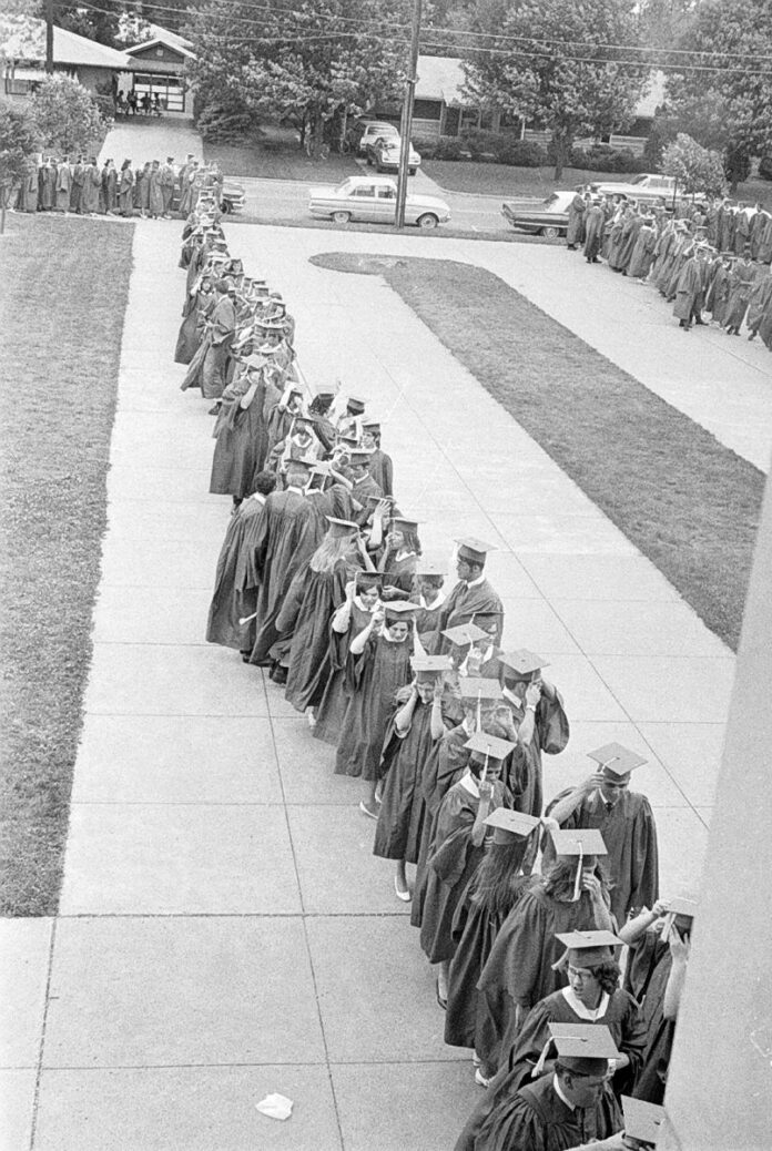 A stiff breeze caused the 735 seniors at Columbus High School to hold onto their hats and tassels as they lined up outside Memorial Gym for the school's 97th graduation ceremony in 1969.