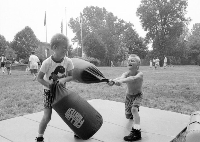 The heat didn't stop Issac and Michael Cheek from challenging each other to a brotherly "fight" with specially designed pillows and a mat during the annual Kids Fair at Mill Race Park in 1994.
