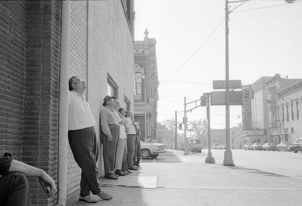 Lewie Zaharako, left, a partner in the Zaharako Confectionery on Washington Street, and several other "sidewalk superintendents" watched as a 170-foot-tall crane owned by Taylor Brothers Construction Co. slowly hoisted a new ornamental railing to the top of Bartholomew County Courthouse clock tower in 1969.