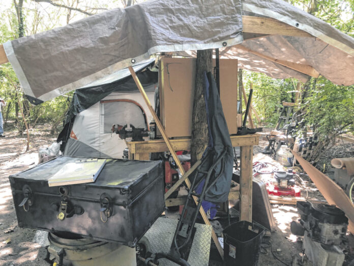 Among the items cluttering the site were lawnmowers, small engines and bicycles. One tent also had a work bench set up beside it in a structure made out of wood.
