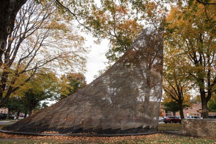 The 30-foot-high Wiikiaami, the 2017 Exhibit Columbus creation of designer Chris Cornelius of Studio:Indigenous of Milwaukee, Wisconsin, was recently dismantled on the grounds of First Christian Church on Fifth Street. Its parts went to the local Kroot Corp. for recycling.