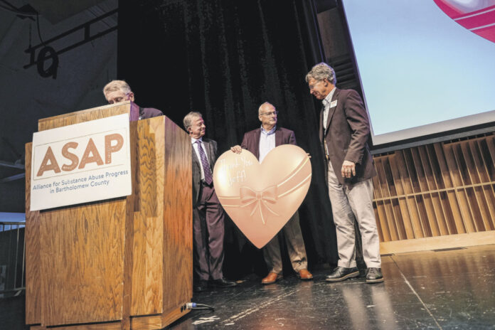 The sponsors of ASAP, Columbus Mayor Jim Lienhoop, Bartholomew County Commissioner Carl Lienhoop and Columbus Regional Health President and CEO Jim Bickel interrupted Jones’ closing remarks at ASAP’s community progress report meeting to pay tribute to Jones’ more than two-year volunteer commitment to ASAP.