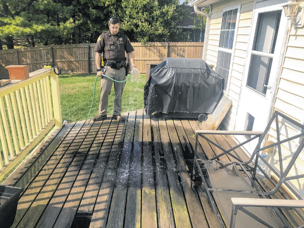 Dougan used a dry powder fire extinguisher in an attempt to put out the fire, Wilson said. After discharging the extinguisher, Dougan reported to emergency operations center dispatchers that the fire was still burning. Dougan then located a garden hose and fully extinguished the remaining flames. When firefighters arrived on the scene, they found Dougan applying water to the smoldering deck, Wilson said.