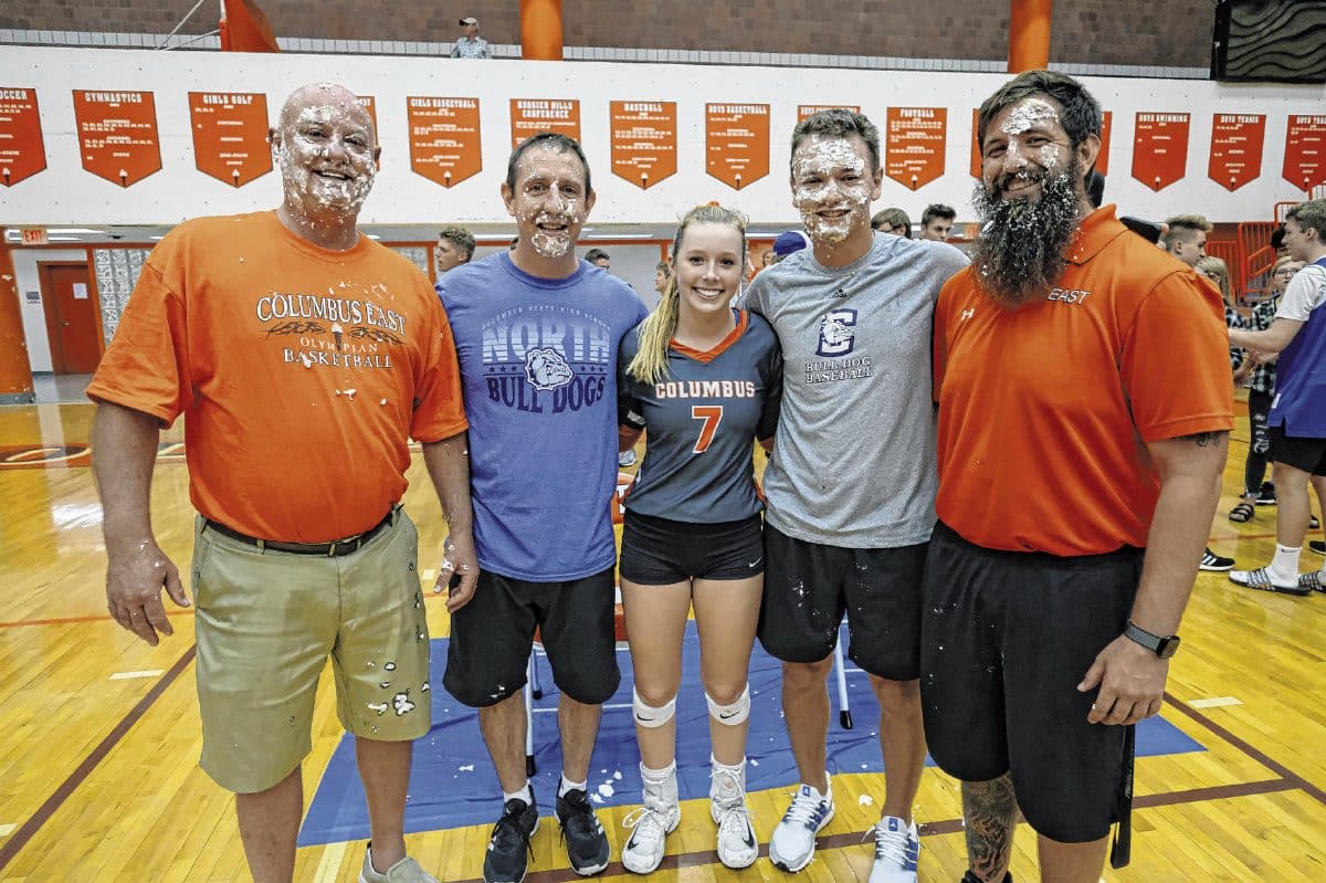 Columbus East senior volleyball player Madyson Foster, center, poses for a photo with East boys basketball coach Brent Chitty, from left, Columbus North boys basketball coach Paul Ferguson, North assistant baseball coach Hunter McIntosh and East strength coach Scott Pherson after a volleyball match between North and East at Columbus East High School in Columbus, Ind., Thursday, Oct. 3, 2019. Foster asked fans to donate money to Wheeler Mission for her senior project. She recruited two coaches from each school to receive a pie in the face based who received the most donations. Each coach raised $215 dollars and got hit with a pie in the face. Mike Wolanin | The Republic