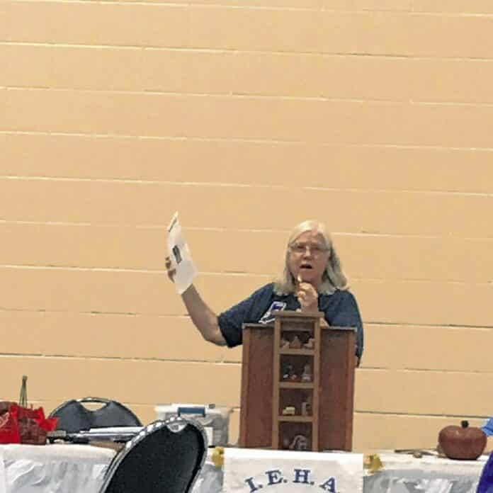 Eighty members of the Madison District of the Indiana Extension Homemakers Association met at the Hope Monravian Church on Sept. 13. Bartholomew County Extension Homemakers hosted the event. Anne Moore, pictured, who is IEHA state president, updates the Madison District members on the current news from the state IEHA and future events planned by the state officers. The guest speaker, Barbara Johnson of Hope, shared a brief history of the Monravian Church and of the town of Hope. Lunch was catered by Willow Leaves of Hope. Submitted photo