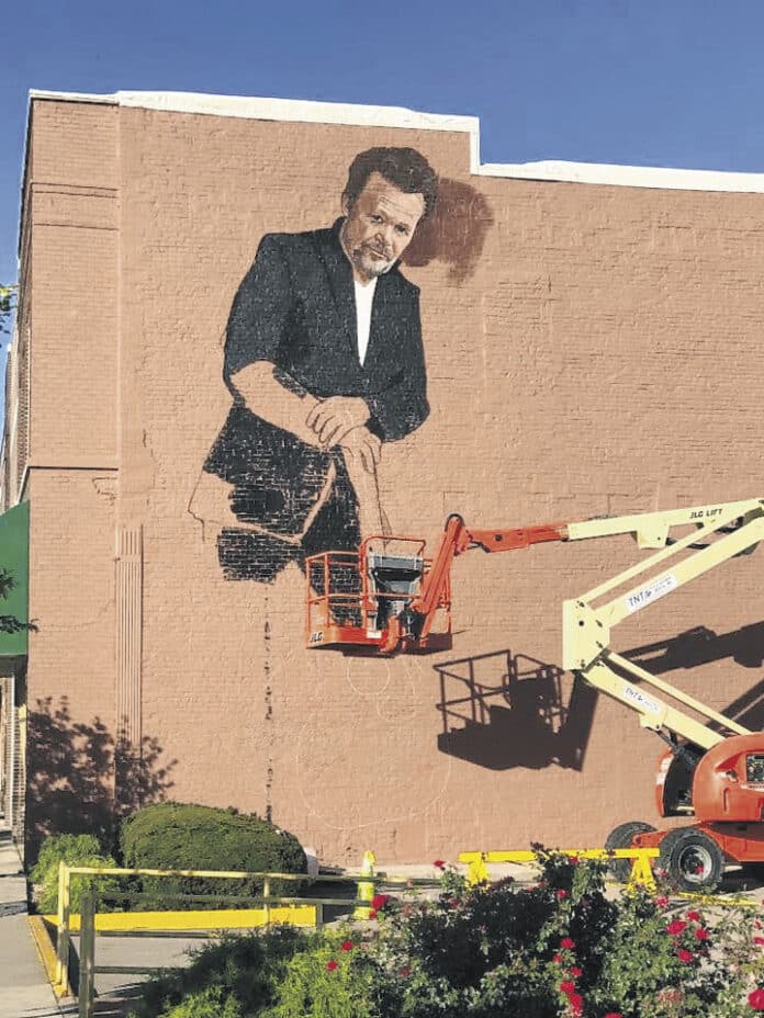 A mural painting of John Mellencamp is being painted on a guitar store building's wall in downtown Seymour. Photo by the Seymour Tribune