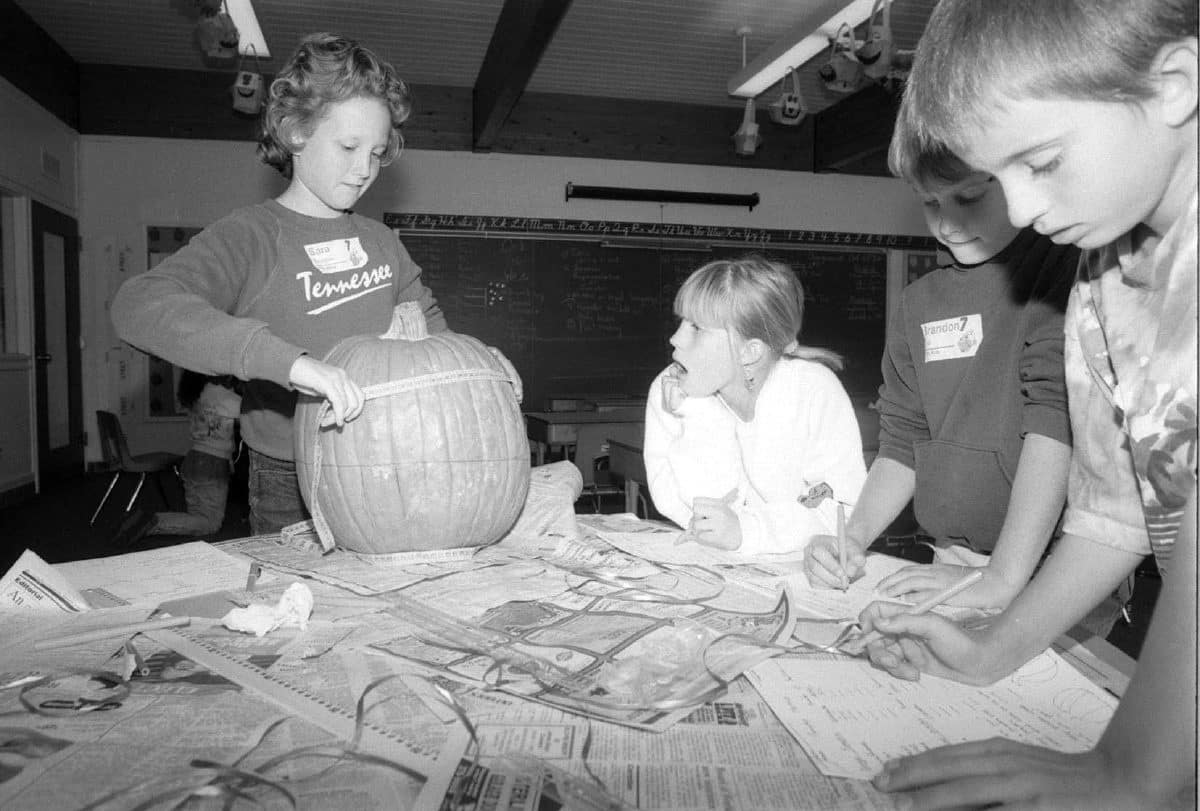 Sara Douglas, left, measured a pumpkin while her fourth-grade classmates waited their turns during the math portion of "Pumpkin Day" at Parkside School in 1994, when pumpkins were used as a common theme in many classes. From The Republic archives