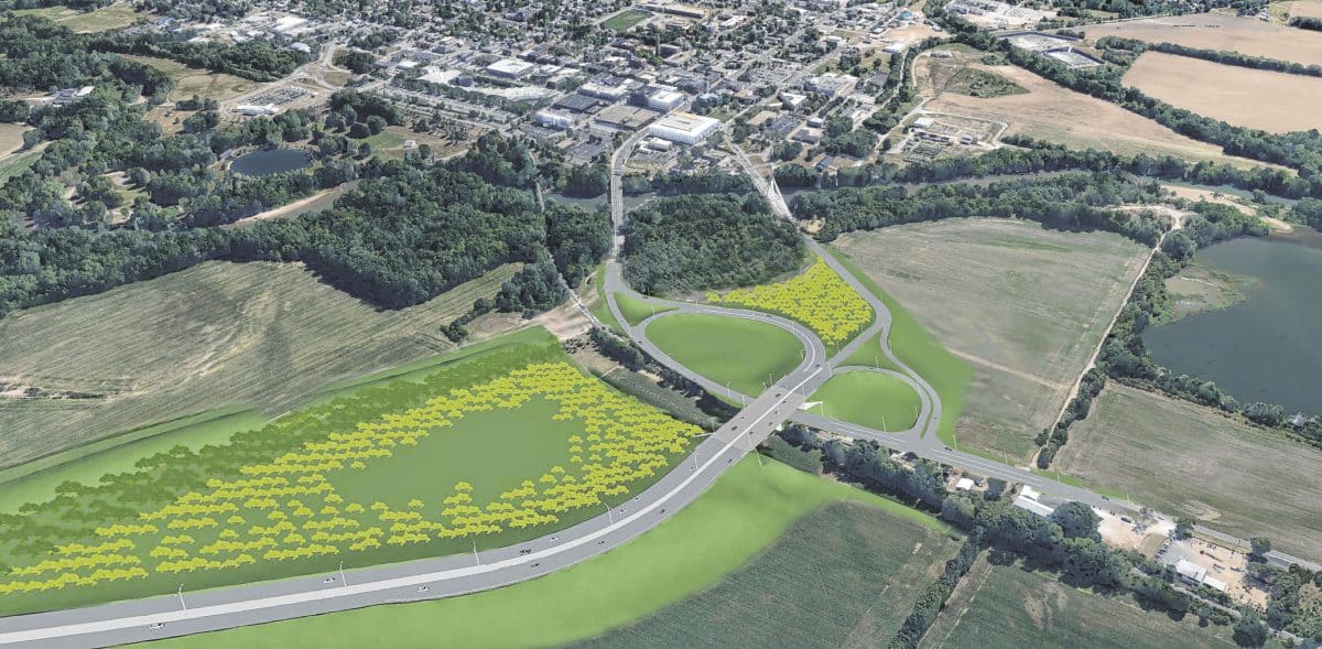 This artist's rendition of the overpass planned for the State Road 46 and State Road 11 railroad intersection shows the cloverleaf pattern, the approach to the overpass from the west, and the curved road for the approach from the south into downtown Columbus. Submitted photo