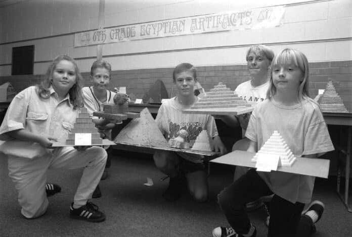 As part of a unit on ancient Egypt, Rockcreek sixth-graders completed projects ranging from miniature pyramids to mummies in 1994. Shown with their projects are Leah Coyle, Shawn Verble, Josh Jordan, Martin Cox and Jessica Waskom. From The Republic archives