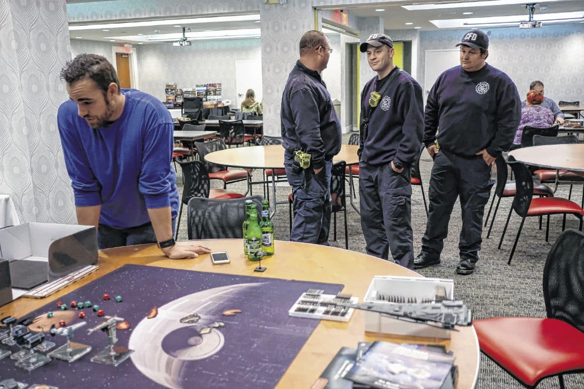 Columbus firefighters Nick Tuttle, from left, Nathan Barnett and Jared Lucas check out a 24-hour board game-a-thon to benefit the Columbus Firemen's Cheer Fund at Hotel Indigo in Columbus, Ind., Friday, Nov. 15, 2019. Mike Wolanin | The Republic