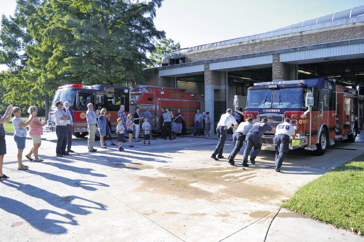Columbus Firefighters push a new fire engine into the fire station following a 2016 wet-down ceremony. (Columbus Fire Department file photo) Submitted photo