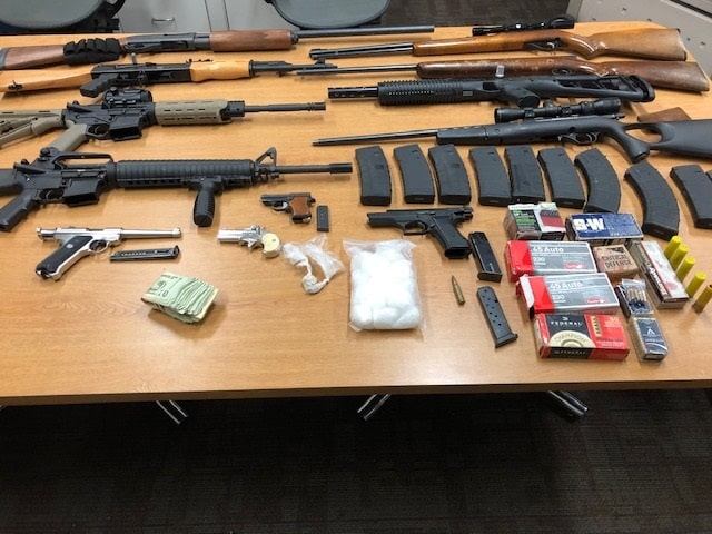 Officers also recovered several long guns including two AR-15 rifles, an AK-47 rifle, four handguns and a large amount of ammunition and U.S. currency.