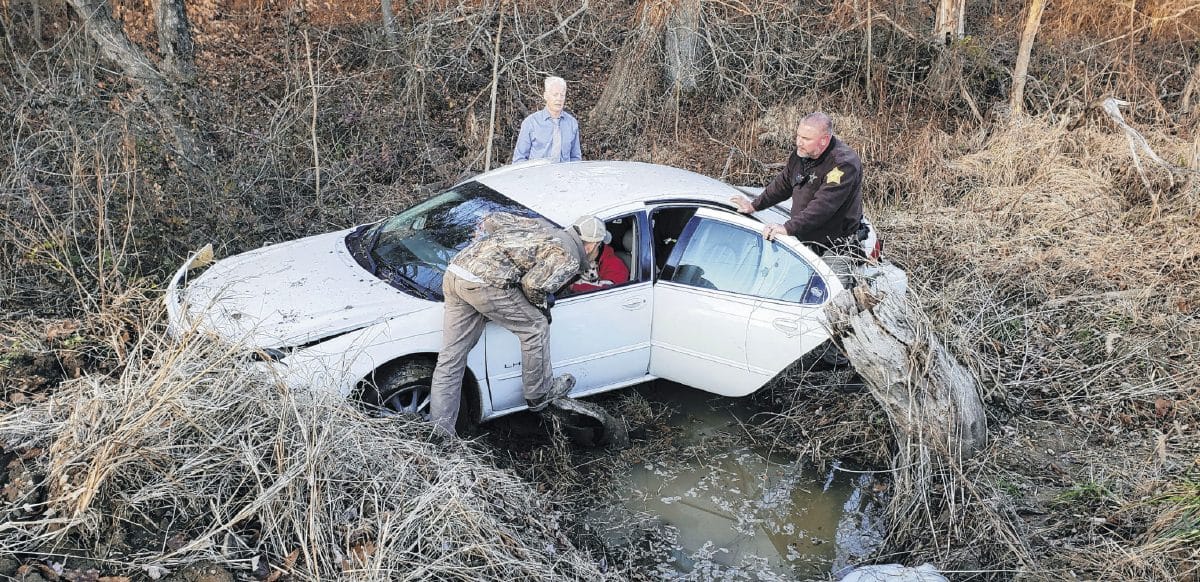 On arrival, sheriff’s department Capt. Dave Steinkoenig observed a white passenger car down an embankment. It appeared the vehicle had run off the side of the roadway, hit a dirt embankment, became airborne and came to rest in a deep ditch, deputies said.