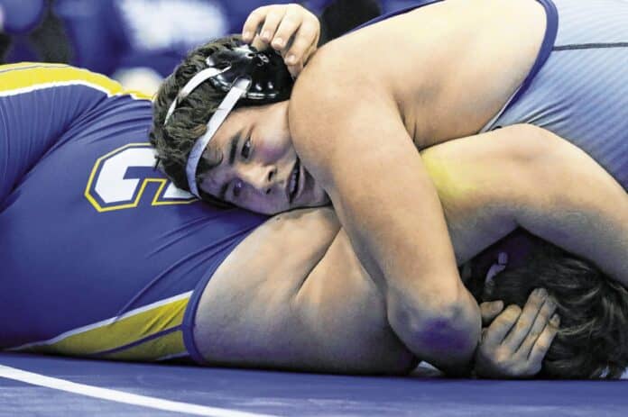 Columbus North's Adam Behling holds down Brown County's Lane Mullins in the 220-pound weight class during the Columbus North Invitational, Saturday, Dec. 14, 2019. Paige Grider for The Republic Paige Grider | For The Republic
