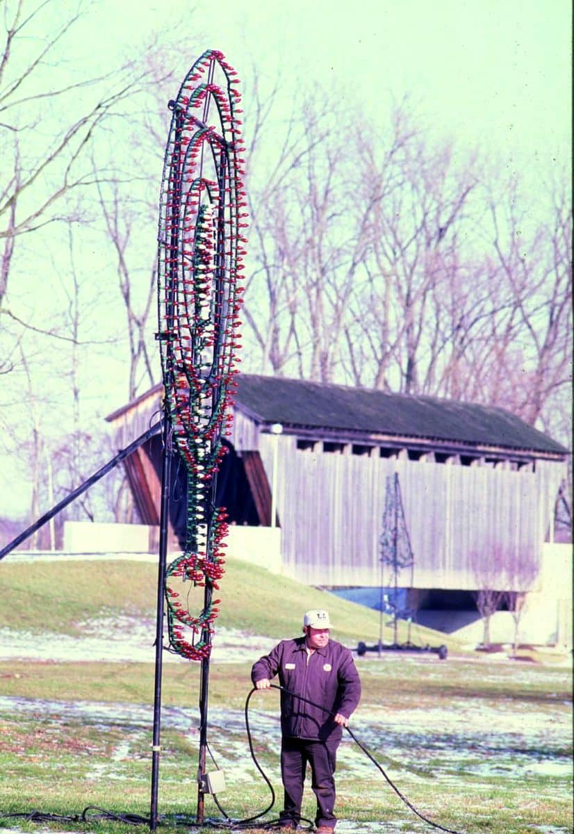 Workers began taking down the 25 lighted Festival of Lights displays at Mill Race Park to be stored at a new warehouse at Columbus Municipal Airport.