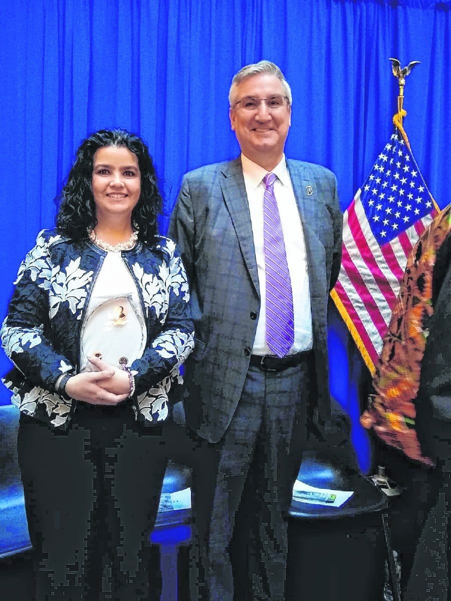 Luz Elena Michel is shown with Indiana Gov. Eric Holcomb after receiving the "Trailblazer Award" at the 29th Annual Dr. Martin Luther King Jr. Indiana Holiday Celebration in Indianapolis.