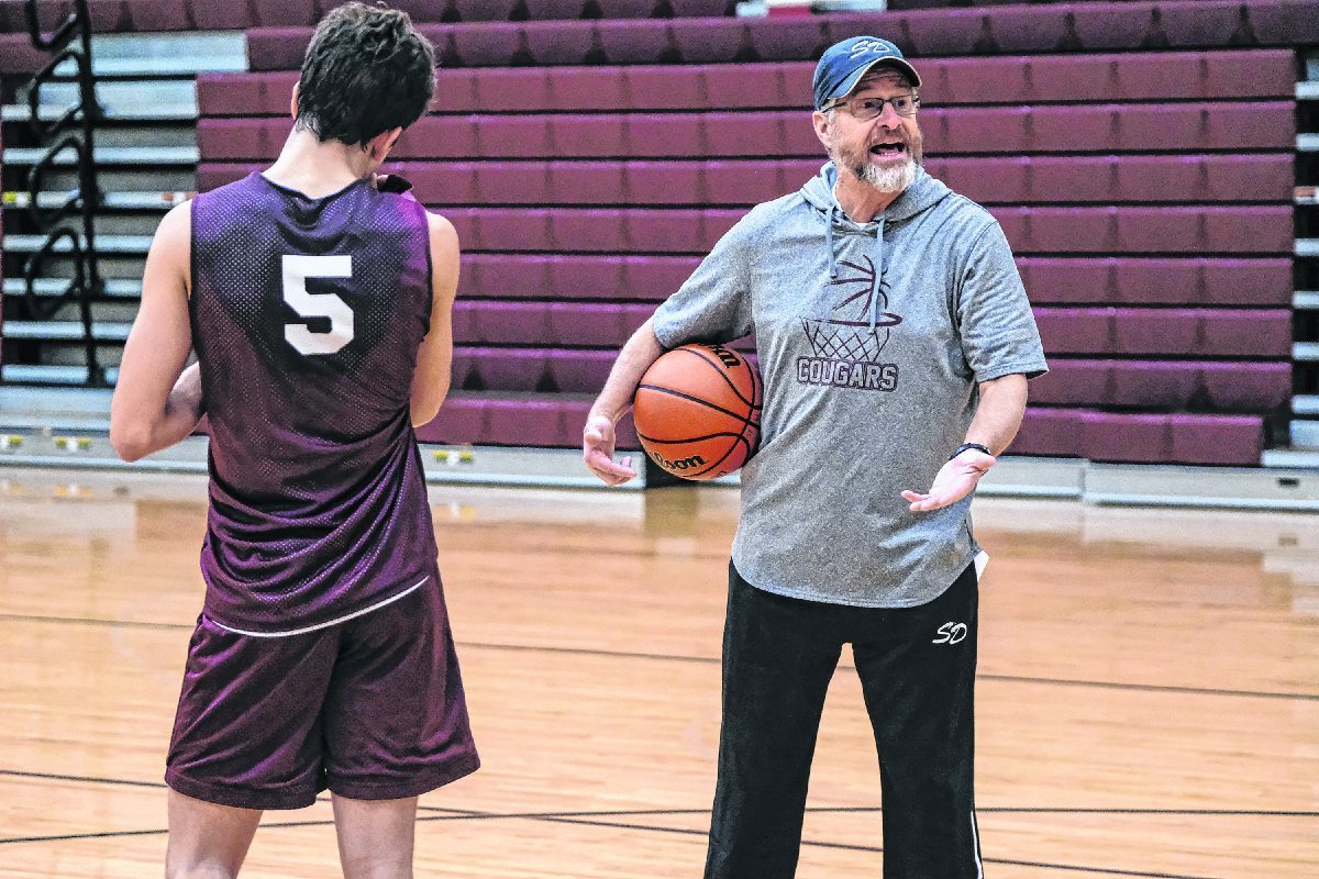 South Decatur boys basketball coach Kendall Wildey instructs his players during practice at South Decatur High School in Greensburg, Ind., Monday, January, 6, 2020. "Defense is desire, defense is guts, defense is grit," Wildey said while talking about tactics during practice. Wildey has led the Cougars to a 10-0 start and a top-six state ranking in Class 2A. They are the top scoring team in the state, averaging more than 90 points a game. Mike Wolanin | The Republic
