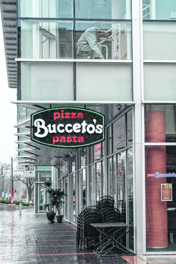 A person cleans windows at The Commons in Columbus, Ind., Thursday, March 19, 2020. To comply with social distancing guidelines to stop the spread of COVID-19, Indiana Gov. Eric Holcomb ordered bars and restaurants, hair salons, barbershops, tattoo parlors and other service related businesses to close down or switch to carry out and delivery services. Mike Wolanin | The Republic