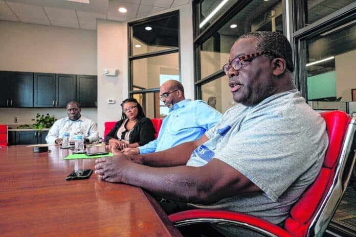The Rev. Mike Harris, with the African American Pastors Alliance, answers questions during an interview at The Republic last year. Also shown is Phil Murray with the Justice Resource Center of Columbus Indiana; Olisa Humes of the Columbus/Bartholomew County NAACP Branch; and Pastor David C. Bosley with the local African American Pastors Alliance. Mike Wolanin | The Republic
