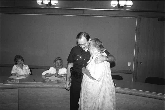 Barbara Stewart got a hug from Columbus Police Chief Charles Imel after she received the department's 1995 Citizen's Service Award for her efforts in promoting diversity in the community and raising private funds for CPD's Pipe and Drum Band. From The Republic archives