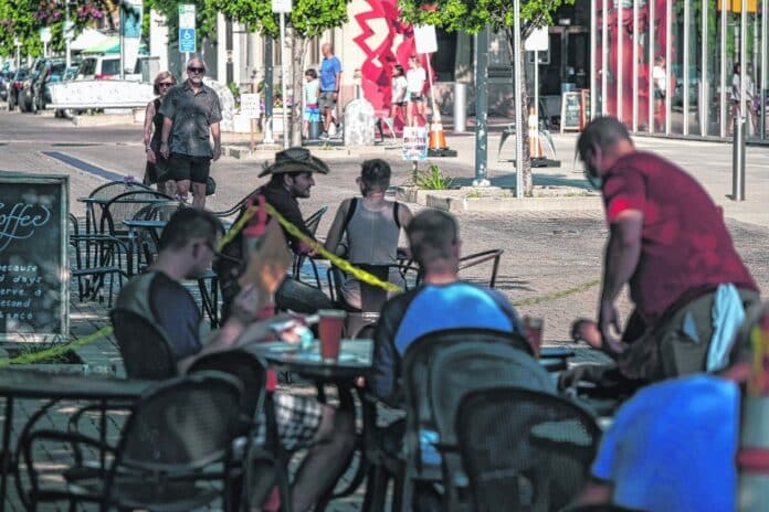 “You can kind of sense a little bit of a shift in people’s attitudes to wanting to get back out there, but yet still distancing and being safe,” said Kurt Schwarze, co-owner of 4th Street Bar and Grill, one of the restaurants that is being allowed to expand out into Fourth Street for additional outdoor seating on weekends.