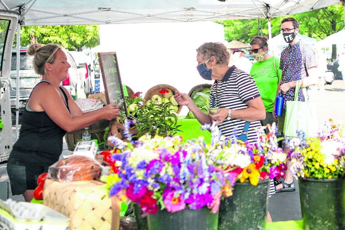 Mackenzey Shatto Pinnowm, left, helps customers at the Poseys and Pumpkins booth during the Columbus Farmer's Market, Saturday, July 4, 2020 Carla Clark | For The Republic