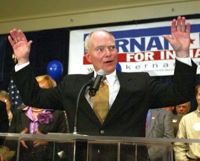 FILE - In this Tuesday, Nov. 2, 2004, file photo, Indiana Gov. Joe Kernan acknowledges the applause of supporters as he concedes to Republican challenger Mitch Daniels in the race for governor in Indianapolis. Kernan has died at age 74. His governor's office chief of staff says Kernan died early Wednesday, July 29, 2020 at a South Bend health care facility. (AP Photo/Michael Conroy, File) The Associated Press