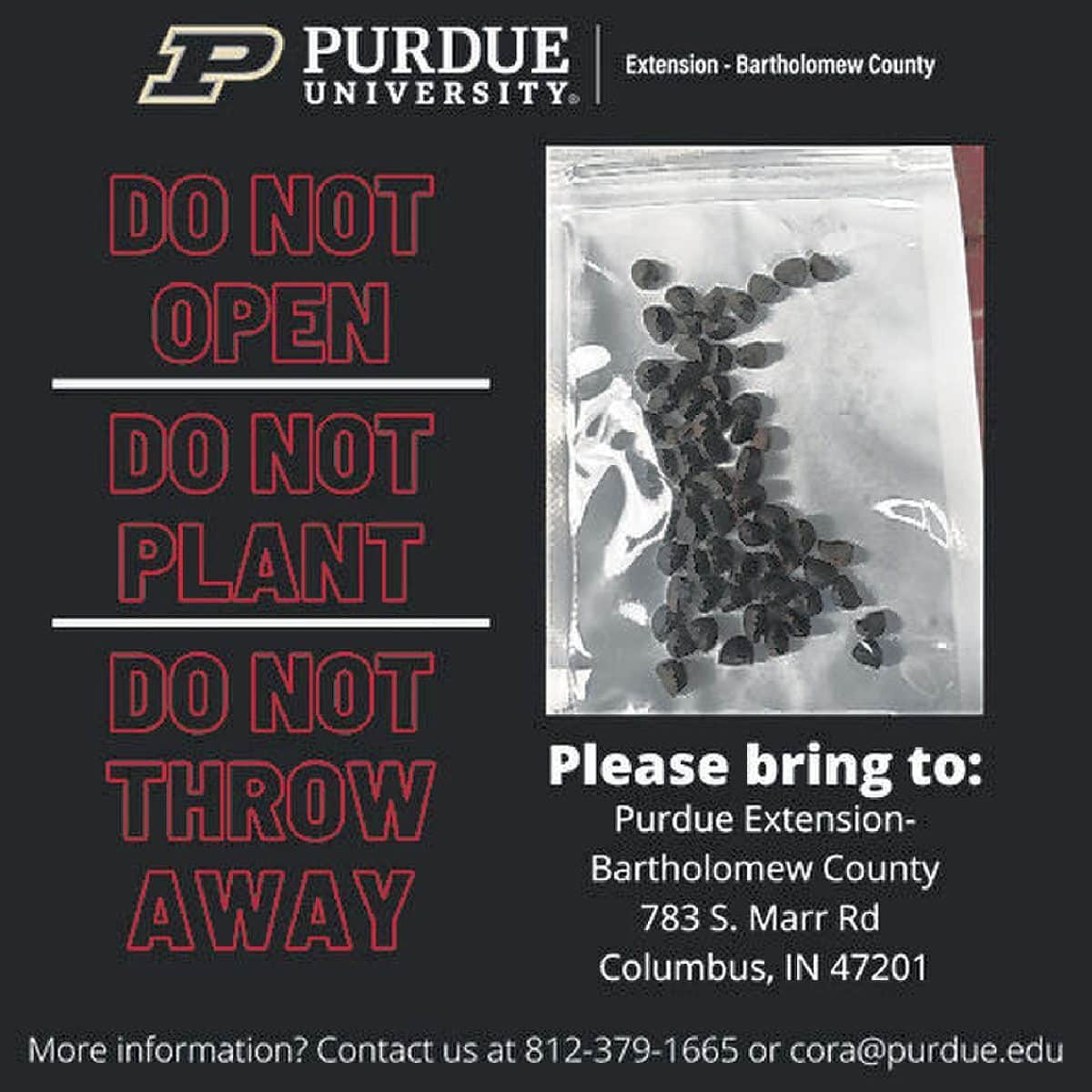 WEST LAFAYETTE — Purdue University, and its extension offices throughout the state including Bartholomew County, are warning individuals about unsolicited packages of unidentified seeds in the mail appearing to be coming from China.