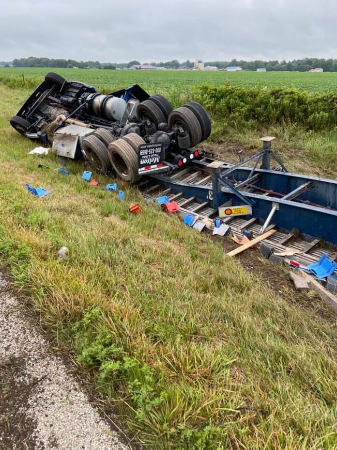 The driver was transported to a local hospital with minor injuries. I-74 Eastbound is down to one lane through the area. Use caution through the area as this may be a lengthy cleanup, said Sgt. Stephen Wheeles, Indiana State Police spokesman.