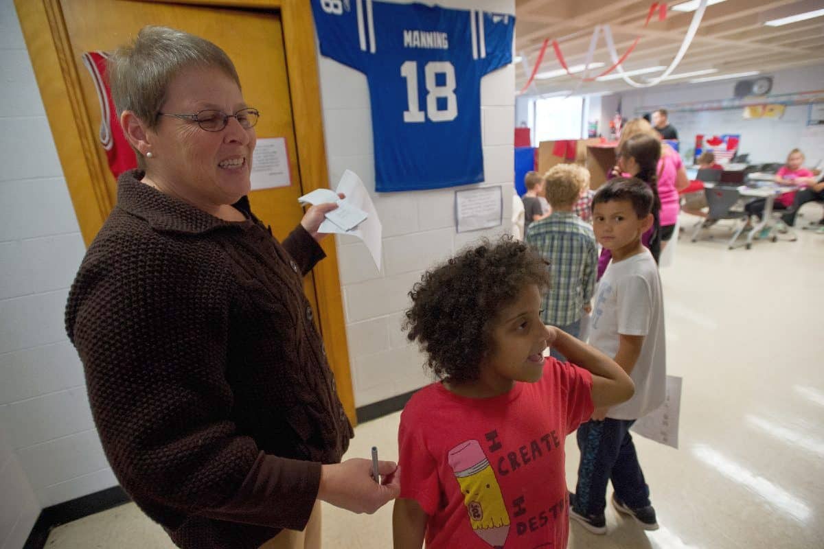 First grade teacher Lori Cash keeps her students in line as they wait to vote during a mock election for the Columbus Signature Academy's Lincoln campus Indiana Kids Election on Election Day in Columbus, Ind., Tuesday, Nov. 8, 2016. Mike Wolanin | The Republic File photo