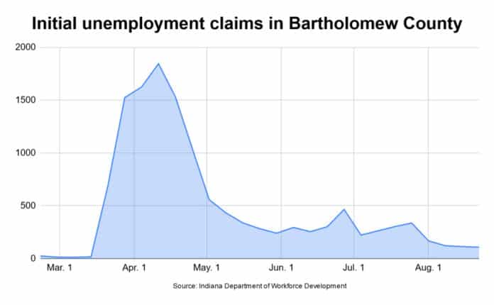 Additionally, a total of 1,452 Bartholomew County workers were drawing jobless benefits the week ending Aug. 15, down from an adjusted 1,609 the week before and 5,039 the week ending May 2.