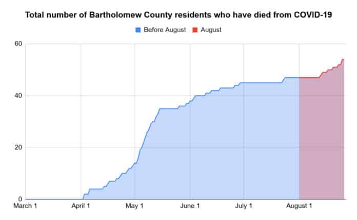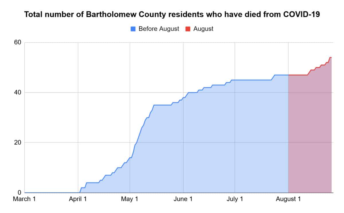 The past week, however, has been the deadliest of the pandemic in Bartholomew County since the week ending June 6, with four local residents reported to have died from the virus, according to the Indiana State Department of Health. A total of 54 Bartholomew County residents have died from COVID-19 so far, including seven since Aug 13.