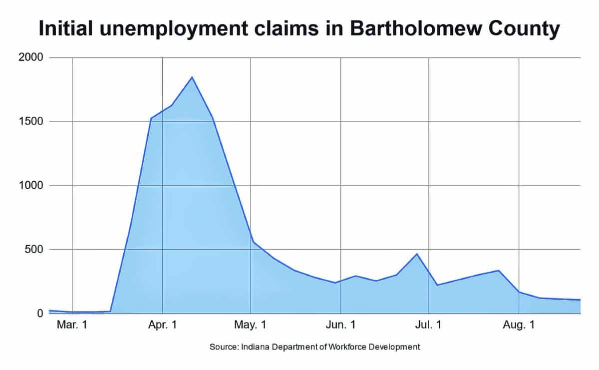 Additionally, a total of 1,452 Bartholomew County workers were drawing jobless benefits the week ending Aug. 15, down from an adjusted 1,609 the week before and 5,039 the week ending May 2.