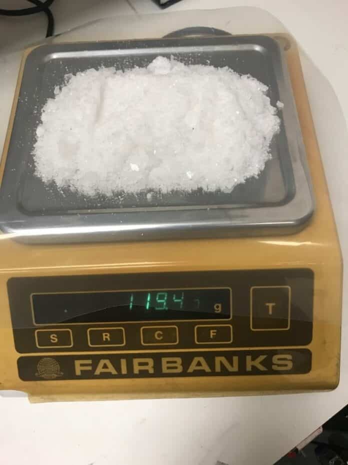 Following the traffic stops, a search warrant was served at a residence located at 7980 W. Goeller Road, where additional drugs, drug packaging materials and drug-related paraphernalia were located. Police confiscated approximately 119.5 grams (approximately one-quarter pound) of methamphetamine along with packaging material, drug-related paraphernalia and a digital scale