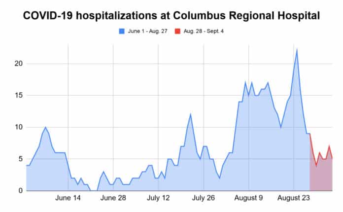 COLUMBUS, Ind. — The number of patients hospitalized with COVID-19 at Columbus Regional Hospital have decreased slightly over the past seven days, at one point reaching a low of four earlier this week.