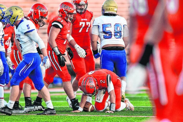 East came back on the ensuing possession to drive the ball down the field. On a fourth down play at the 41-yard line, quarterback Malachi Parks scrambled to the right side and found an open Crase Bergman for the touchdown to cut it to 52-28 after the Nathaniel Hedrick extra point.