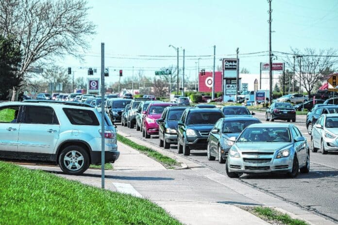 Cars line up on National Road for a Gleaners drive-thru food pantry at the Cummins Fuel Systems plant in Columbus, Ind., Wednesday, April 8, 2020. Cars snaked through the parking lot and were lined up on Marr and National roads as people converged on the location to pick up boxes of food. Organizers ran out of food about an hour after opening the drive-thru pantry. They prepared enough supplies for 600 people. Mike Wolanin | The Republic