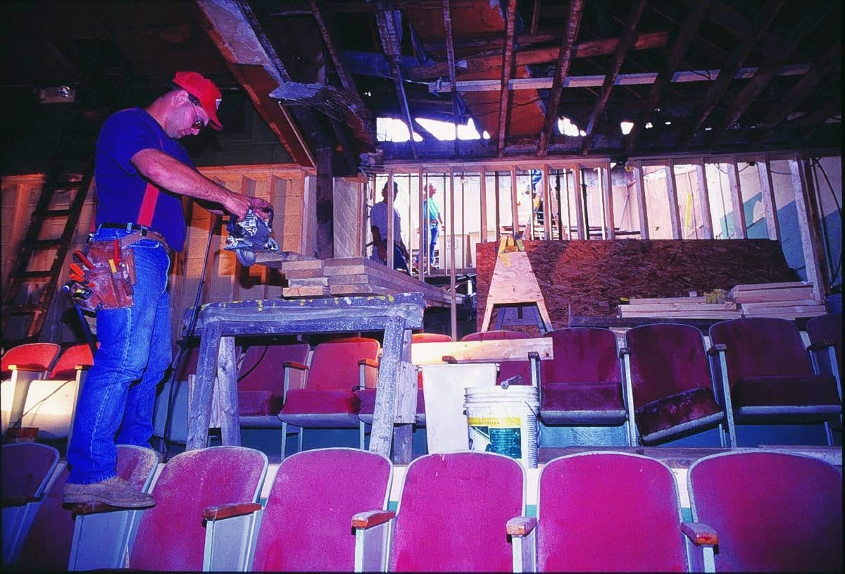 Clyde Smith of Columbus Roofing cut new rafters for the roof behind the balcony at the Crump Theatre in 1995, part of the ongoing "Save the Crump" project. From The Republic archives