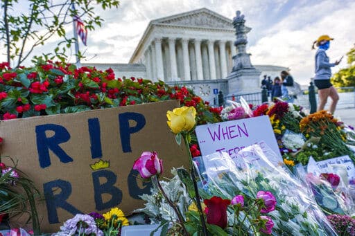 WASHINGTON (AP) — Mourners dropped off bouquets and gathered outside the Supreme Court early Saturday in quiet tribute to the late Justice Ruth Bader Ginsburg. Homemade cardboard signs and a collection of flowers blanketed the court’s grounds.