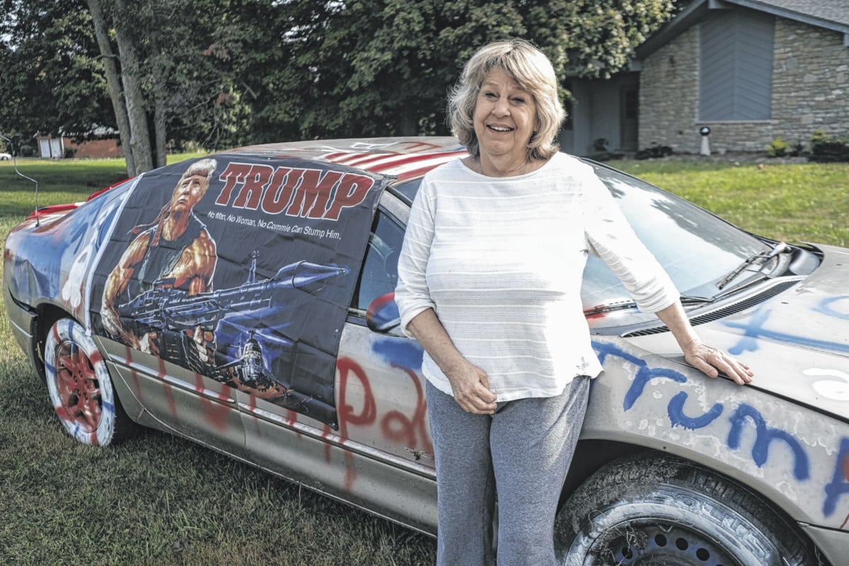 That’s where Margie Boulanger found an unusual discovery in her front yard off County Road 825E — an older, tan-colored Dodge Intrepid covered with banners and spray-paint promoting President Donald Trump’s re-election campaign.