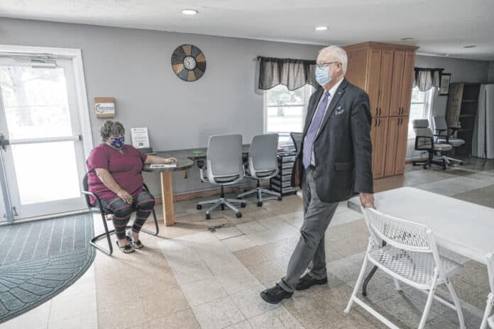 Beth Turner, vice president of the American and Roby Anderson Community Center, and Tom Dell, city councilman and board member of the community center, meet inside the community center in Columbus, Ind., Friday, Oct. 9, 2020. Mike Wolanin | The Republic