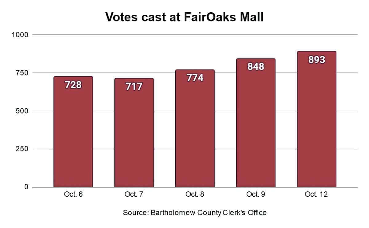 A total of 893 votes were cast at FairOaks Mall on Monday, raising the five-day total to 3,959 since early in-person voting started on Oct. 6, said Bartholomew County Clerk Jay Phelps.